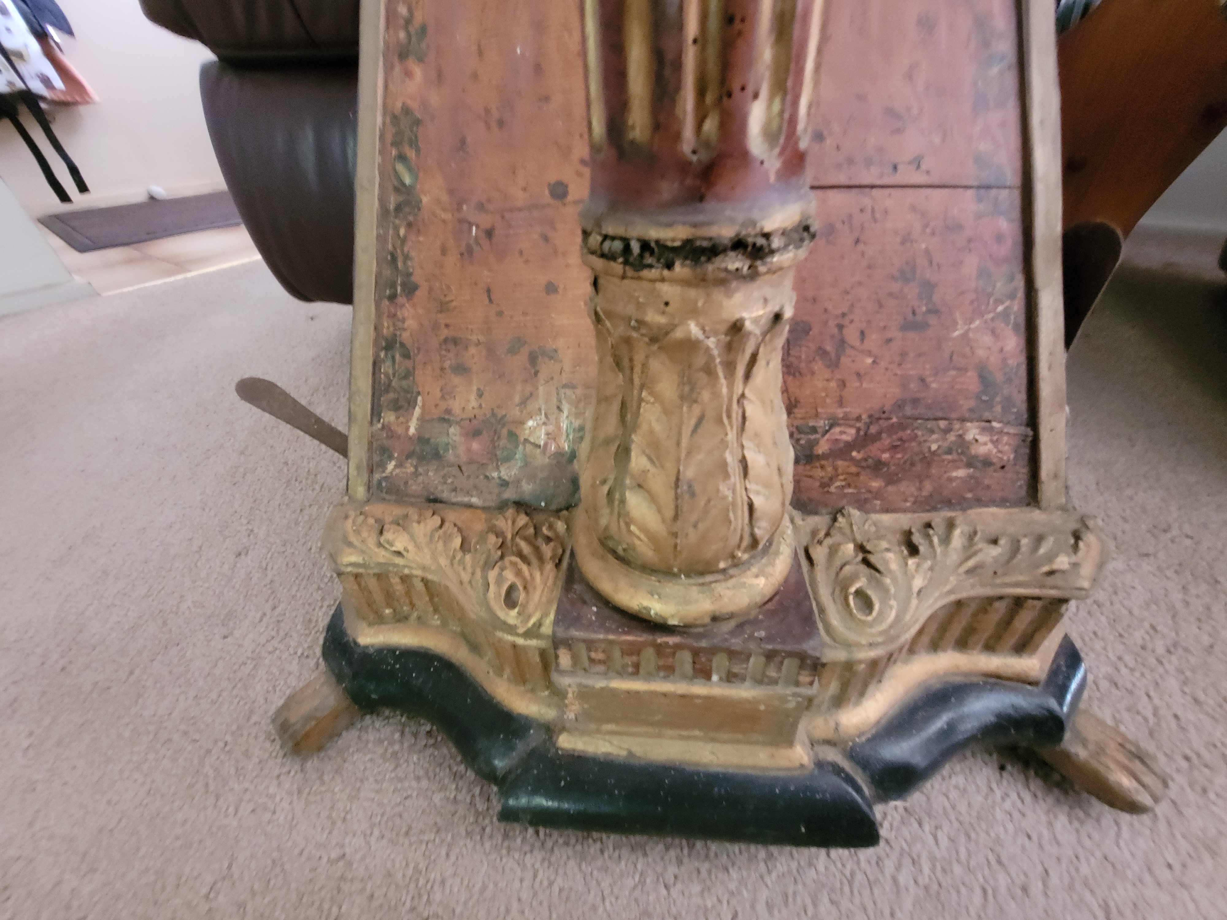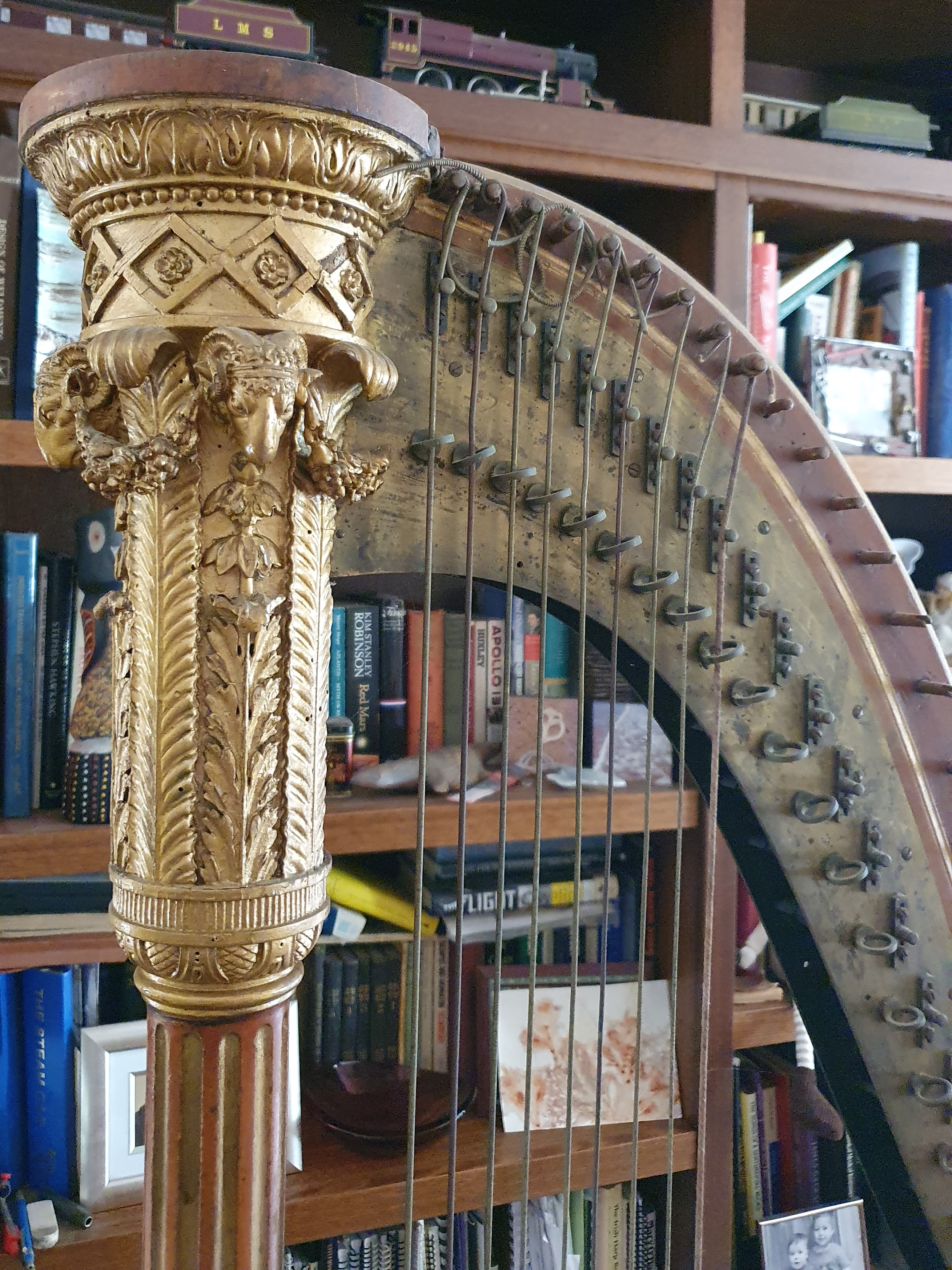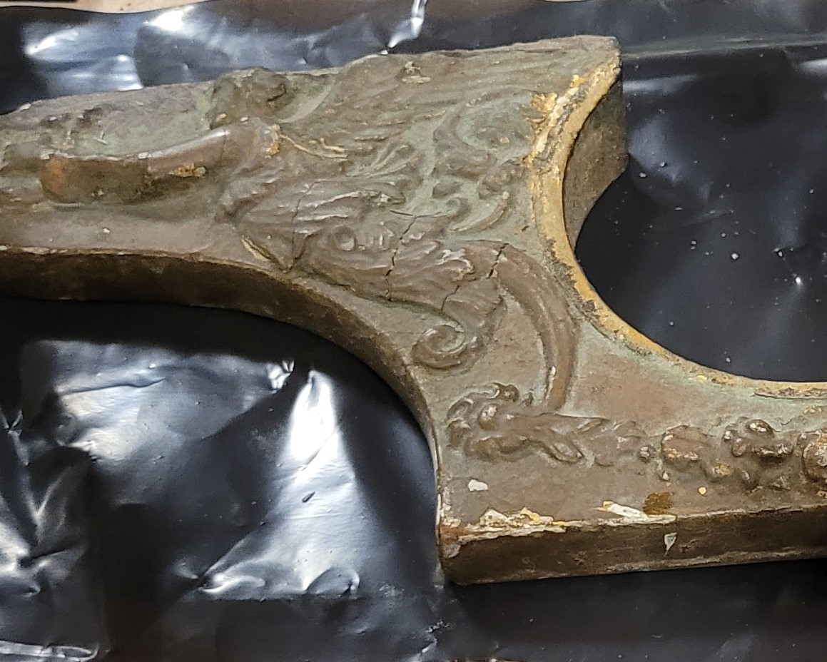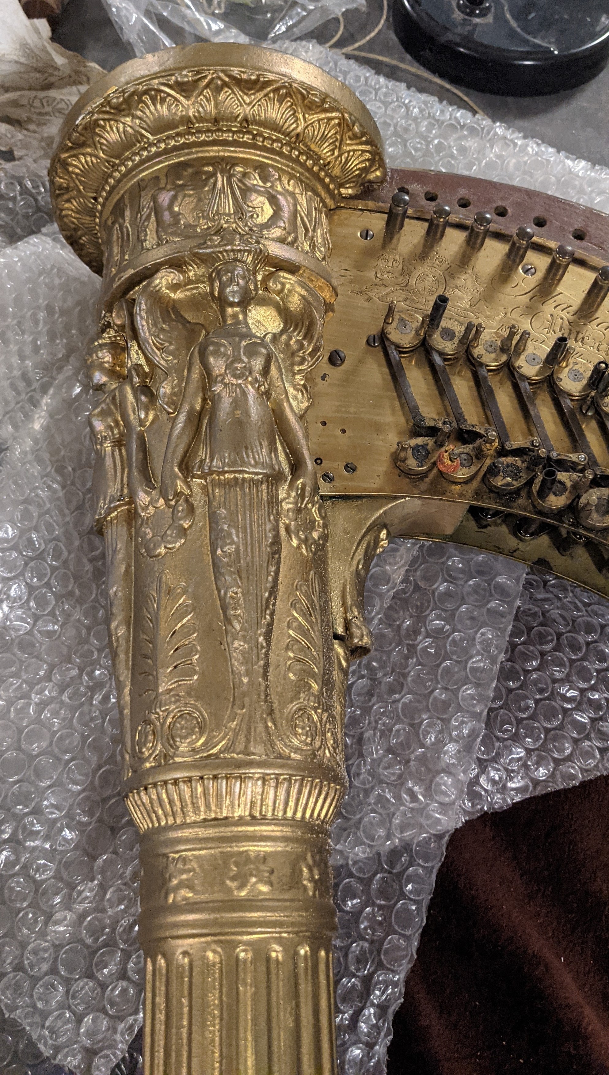 The front pillar and base of a harp is often very decorative and distinctive. This decoration, along with the makers plate, can be used to identify the make and model of harp. As the ornamentation of harps changed over time, they can also be used to date instruments. Initially, the decoration comprised painted wood carving but around 1810 London harp makers shifted to using ‘compo’ relief decorations made using moulds. One recipe for compo from this period gives the ingredients as whiting (finely ground chalk), hide glue and oil (Baldwin 2020:213). Once the compo hardened and was released from the mould, it was attached to the harp and painted gold or gilded. Common compo decorations were inspired by Grecian and Gothic art motifs, and included plants, animals and figures such as acanthus flowers and leaves, caryatids, cherubs, rams heads, lions, floral wreaths or swags and gargoyles.